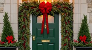 Frame your front door with a full, symmetrical garland. Use outdoor-safe materials and finish with a large bow or matching wreath to create a welcoming holiday entryway.