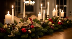 Lay a garland down the center of your dining table as a festive runner. Mix in candles, ornaments, and small figurines to make your table feel like a Christmas centerpiece.