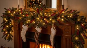 Start with the timeless look — a lush evergreen garland across your fireplace mantel. Add pinecones, red berries, and warm white lights for that traditional Christmas feel that never goes out of style.