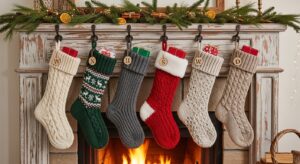 Chunky knit or cable-patterned stockings in neutral colors create an inviting, hygge-inspired atmosphere that feels both stylish and comforting.