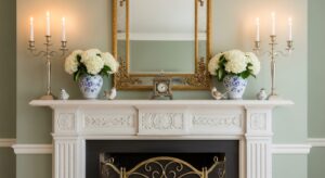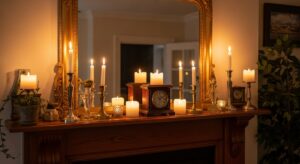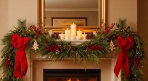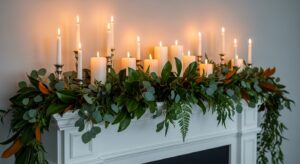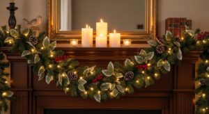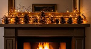 Place a large mirror or seasonal artwork above the mantel to create balance and draw the eye upward. Reflective surfaces help enhance the glow of your lights and candles.