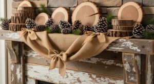 Use wood slices, burlap, and neutral tones for a cozy farmhouse touch. Rustic materials bring warmth and texture to your holiday display.