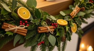 For a fresh twist, weave sliced dried oranges and cinnamon sticks into your garland. The scent adds an extra festive note to your space.
