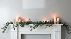 Less can be more. Keep your mantel simple with white candles, eucalyptus branches, and a few neutral ornaments for a serene Scandinavian vibe.