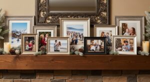 Frame a few of your favorite family photos in gold or wooden frames. It’s a sentimental way to make your mantel both decorative and personal.