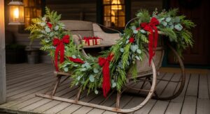 Add nostalgic flair with an old-fashioned wooden sleigh or a pair of vintage ice skates leaned against the door. Accentuate with greenery and bows for a picture-perfect scene.
