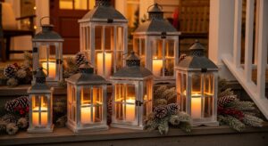 Cluster lanterns filled with candles or fairy lights along your porch steps. Mix different sizes for depth and place a few pine sprigs or ornaments around them for a rustic winter feel.