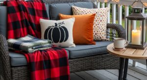 If your porch has space, add a small bench or rocking chair. Drape it with plaid blankets and decorative pillows to create a spot that’s both festive and inviting.
