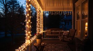 Add sparkle by hanging string lights around your doorframe, windows, and roofline. Warm white bulbs give a cozy glow, while multi-colored lights create a joyful, family-friendly vibe.