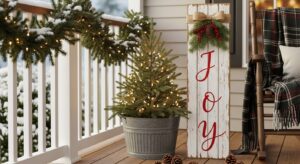 Decorate your space with wooden signs that say “Believe,” “Let it Snow,” or “Joy.” They add personality and warmth to your porch’s holiday setup.