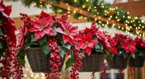 Fill your hanging baskets with seasonal greenery, poinsettias, and red berries. Add a sprinkle of faux snow for a whimsical winter touch.