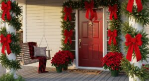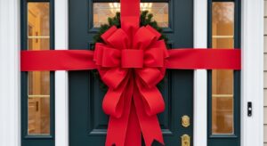 Transform your front door into a giant Christmas present by wrapping it with a wide red ribbon and a large bow in the center. It’s a simple DIY idea that makes a big impact.