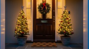 Place small evergreen trees in decorative pots beside your front door. Decorate them with ribbons, lights, and ornaments for a mini forest effect that adds charm and symmetry.