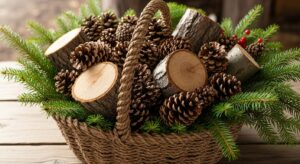Create a nature-inspired vignette using pinecones, birch logs, twigs, and evergreen branches arranged in a decorative basket. It brings cozy, woodland charm to your entryway.