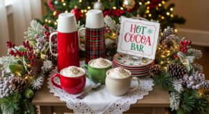 Add a small table with mugs, cocoa mix, and Christmas signs for a cute and interactive porch feature.