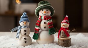 Create a cheerful snowman scene with different-sized snowmen made from wood, fabric, or inflatables.