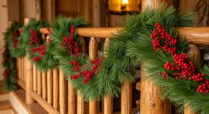 Bring the outdoors in with pine garlands, wooden reindeer, and natural textures like burlap and twine.