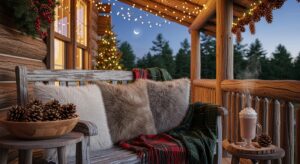 Plaid blankets, faux fur pillows, and pinecones give your porch that “mountain lodge” Christmas feel.