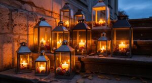 Cluster lanterns filled with ornaments, candles, or fairy lights for soft, cozy illumination.