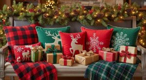 Decorate your bench with pillows, blankets, and wrapped gift boxes for cozy Christmas charm.