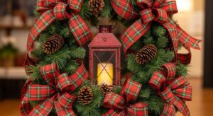Mix plaid ribbons, garlands, and pinecones for a warm and traditional holiday welcome.