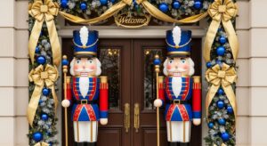 Flank your front door with nutcracker statues and decorate with royal blue and gold details.