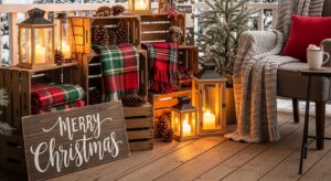 Use wooden crates, plaid blankets, lanterns, and burlap ribbons to create a cozy, down-to-earth farmhouse vibe.