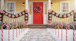 Incorporate red and white striped decor — candy cane stakes, ribbon bows, and peppermint wreaths — for a playful and sweet porch look.