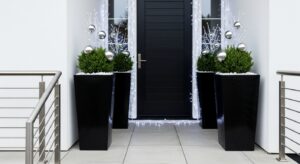 For a chic twist, use black planters, white lights, and silver decor for sleek, modern appeal.