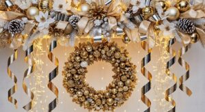 Gold ribbons, metallic ornaments, and white lights create a luxurious and glowing entrance.