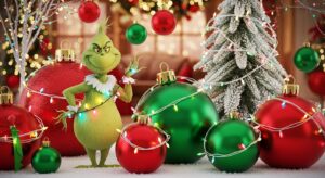 Add fun and humor with green accents, quirky ornaments, and a Grinch cutout for playful vibes.