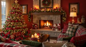 Red and green represent holiday cheer and nature’s winter beauty. Decorate with red ribbons, plaid blankets, green garlands, and festive pillows. A few gold or silver accents add sophistication and sparkle.