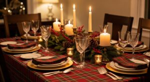 Use a simple centerpiece of candles, evergreens, and berries. Classic plaid runners or gold chargers tie everything together, creating an atmosphere of festive elegance for family gatherings.