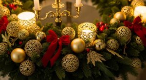 Gold accents instantly elevate any traditional theme. Think gold candle holders, ornaments, and ribbons intertwined with greenery. The subtle shimmer adds warmth and luxury to your classic design.