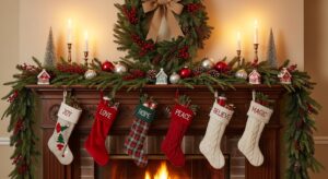 Layer it with evergreen garlands, red candles, and hanging stockings. Add family photos or framed vintage Christmas cards for sentimental warmth.