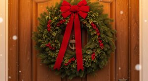 Choose one made of evergreen branches, holly, and berries, tied with a rich red or tartan bow. For a refined look, add golden bells or ornaments to catch the light.