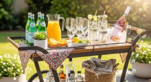 Take entertaining outdoors with a bar cart stocked with your favorite drinks, glasses, and mixers. It’s an easy way to elevate your gatherings and add a resort-style vibe.