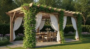 A pergola offers shade during the day and a frame for hanging lights or vines at night. Draping curtains or outdoor fabric can make the area feel private and luxurious.