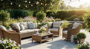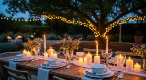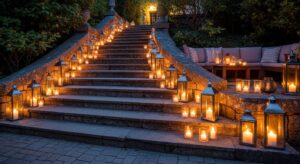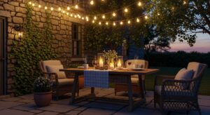 Soft candlelight adds charm and tranquility. Use lanterns, flameless candles, or solar lights to create a warm, flickering glow around your seating area.