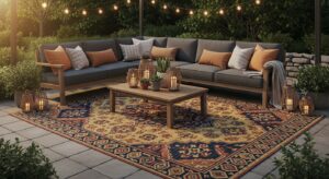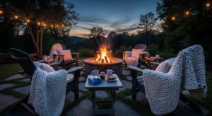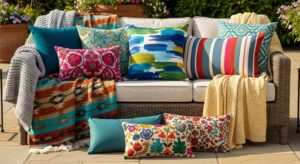 Textiles are key to coziness. Use outdoor-safe blankets and pillows to bring softness and warmth — ideal for lounging during chilly evenings.