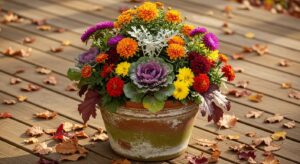 Chrysanthemums, asters, marigolds, and pansies are excellent choices because they thrive in cooler temperatures and bring bold seasonal color to containers.