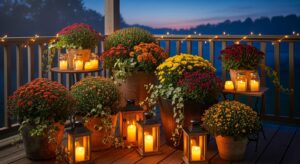 As autumn days shorten, lighting becomes part of the cozy atmosphere. Add lanterns, string fairy lights through your porch railing, or tuck small solar-powered lights into your container arrangements.