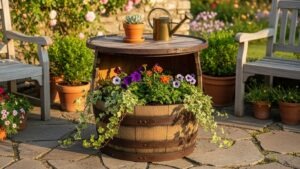 Cut a wine barrel in half or use the top as a tabletop. It can function as a garden table or planter, bringing a rustic, vintage feel to your outdoor space.