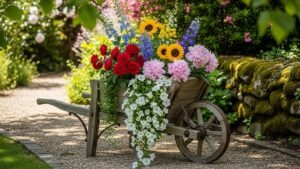 Rusty or retired wheelbarrows make perfect mobile planters. Fill with soil and seasonal flowers. The raised height allows for easy access, and the aged metal adds a rustic charm.