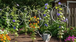 Mount old bicycle wheels vertically against walls or fences. Use them to support climbing plants like sweet peas or morning glories for a creative, circular trellis design.