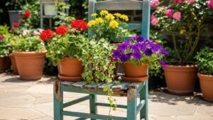 Chairs missing seats or legs can be repurposed as plant stands. Place potted plants on the remaining surfaces or suspend planters from the back for an unexpected, whimsical look.