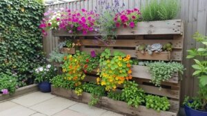 Repurpose a wooden pallet into a vertical garden. Add small planters, soil, and plants between the slats. Pallet walls are ideal for small yards or patios where space is limited.