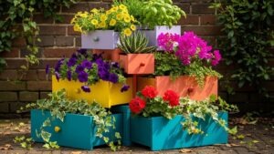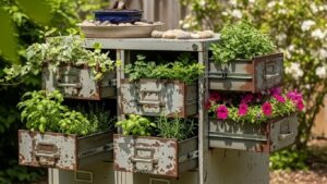 Stack old drawers at angles to create a multi-level planter display. Paint them in vibrant or pastel shades for added personality. Each drawer can house different plant types.