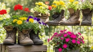 Worn-out boots can be filled with soil and flowers. Line them along a path or steps to add a quirky, playful touch to your garden while recycling old footwear.