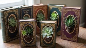 Carve out unusable, water-damaged books to create small planters. Perfect for succulents or small herbs, they add literary charm and creativity to outdoor shelves or tables.